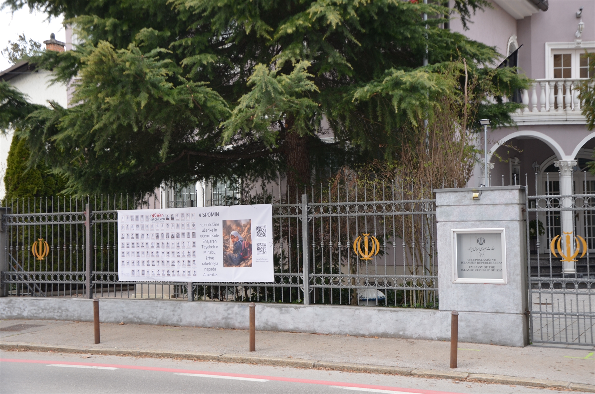 نصب تصویر یادبود دانش آموزان شهید مدرسه شجره طیبه در شهر میناب که در جریان حمله وحشیانه آمریکا به شهادت رسیدند در محل ساختمان سفارت جمهوری اسلامی ایران در لوبلیانا.